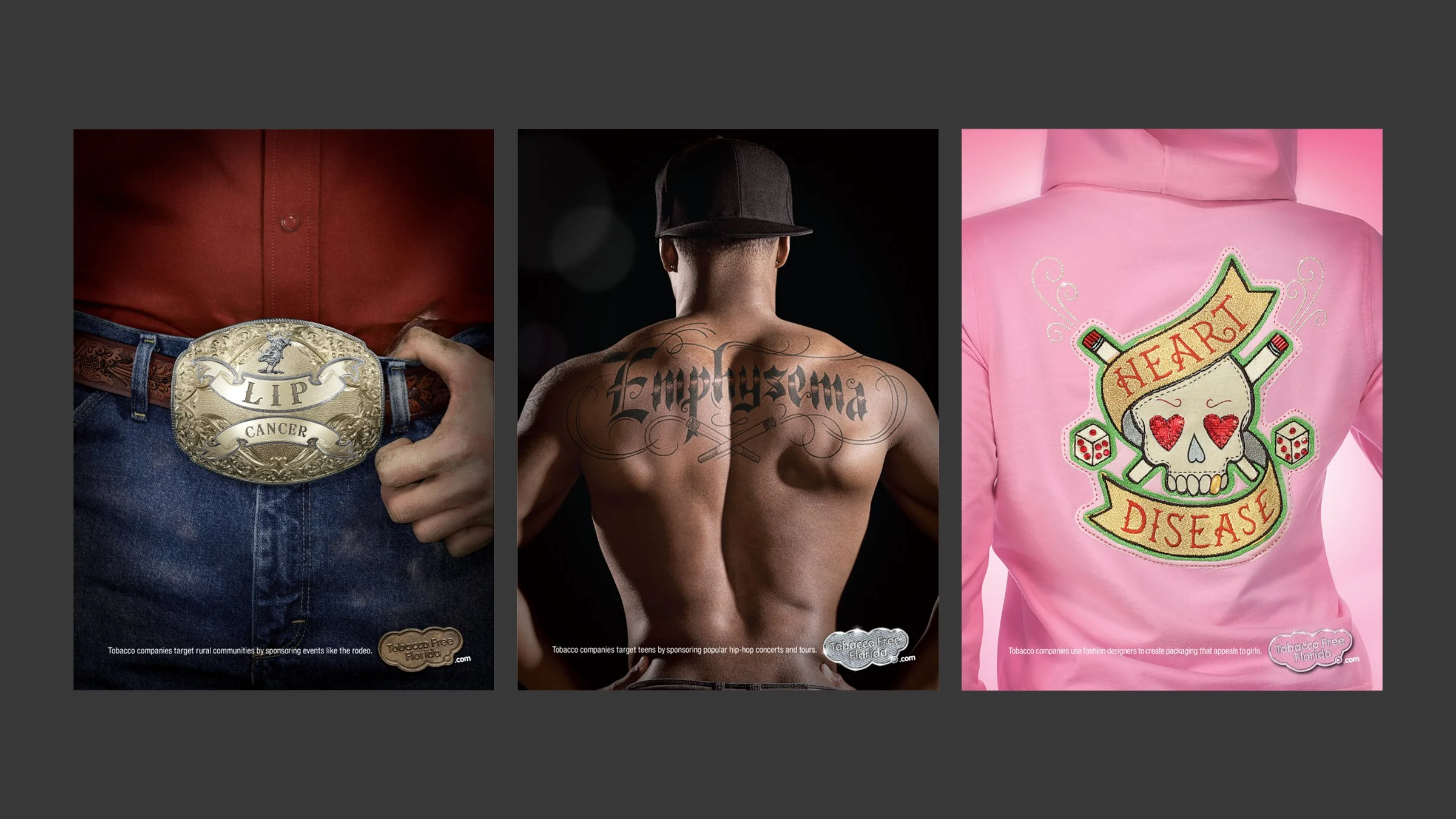 Three images promoting tobacco awareness: the first showing a belt buckle labeled "LIP CANCER"; the second showing a tattooed back with the word "EMPHYSEMA"; the third featuring a pink hooded jacket with the words "HEART DISEASE."